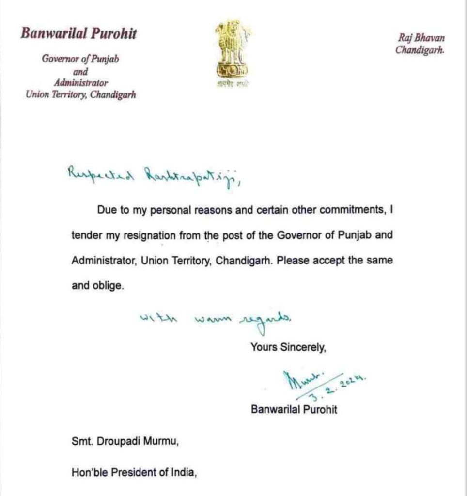 Chandigarh,03 Feb,2024,(Punjab Today News Ca):- ਪੰਜਾਬ ਦੇ ਰਾਜਪਾਲ ਬਨਵਾਰੀ ਲਾਲ ਪੁਰੋਹਿਤ ਨੇ ਅਸਤੀਫਾ ਦੇ ਦਿੱਤਾ ਹੈ। ਨਿੱਜੀ ਕਾਰਨਾਂ ਦਾ ਹਵਾਲਾ ਦਿੰਦੇ ਹੋਏ ਹੋਏ ਉਨ੍ਹਾਂ ਨੇ ਆਪਣਾ ਅਸਤੀਫਾ ਰਾਸ਼ਟਰਪਤੀ ਦ੍ਰੋਪਦੀ ਮੁਰਮੂ (President Draupadi Murmu) ਨੂੰ ਭੇਜ ਦਿੱਤਾ ਹੈ।ਰਾਜਪਾਲ ਪੁਰੋਹਿਤ ਨੇ ਆਪਣੇ ਅਸਤੀਫੇ ਵਿਚ ਲਿਖਿਆ ਹੈ-‘ਆਪਣੇ ਨਿੱਜੀ ਕਾਰਨਾਂ ਤੇ ਕੁਝ ਹੋਰ ਵਚਨਬੱਧਤਾਵਾਂ ਕਾਰਨ ਮੈਂ ਪੰਜਾਬ ਦੇ ਰਾਜਪਾਲ ਤੇ ਪ੍ਰਸ਼ਾਸਕ, ਕੇਂਦਰ ਸ਼ਾਸਿਤ ਪ੍ਰਦੇਸ਼ ਚੰਡੀਗੜ੍ਹ ਦੇ ਅਹੁਦੇ ਤੋਂ ਆਪਣਾ ਅਸਤੀਫਾ ਦਿੰਦਾ ਹਾਂ। ਕ੍ਰਿਪਾ ਕਰਕੇ ਇਸ ਨੂੰ ਸਵੀਕਾਰ ਕੀਤਾ ਜਾਵੇ।